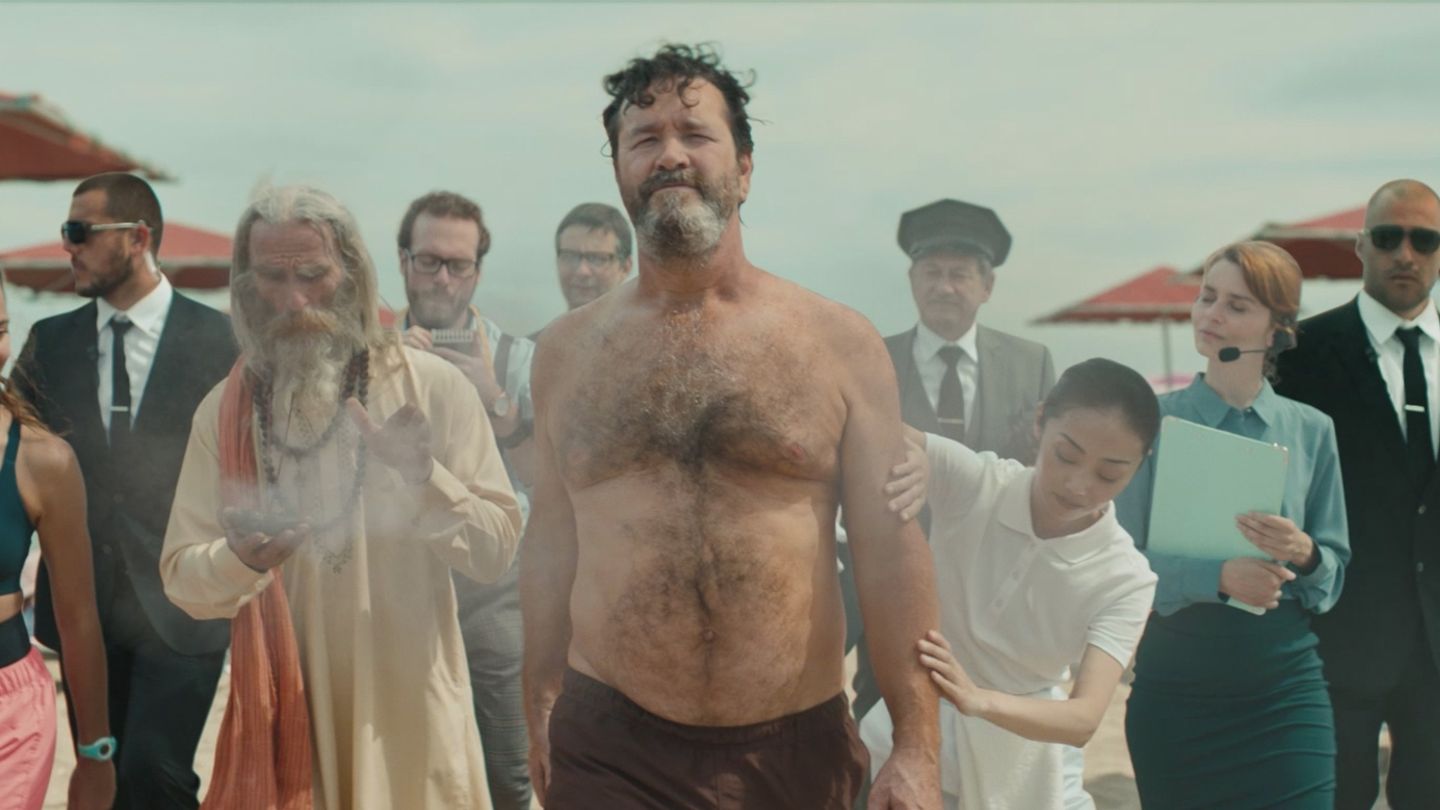 A man's entourage tends to his every need as he makes his way on to a beach.
