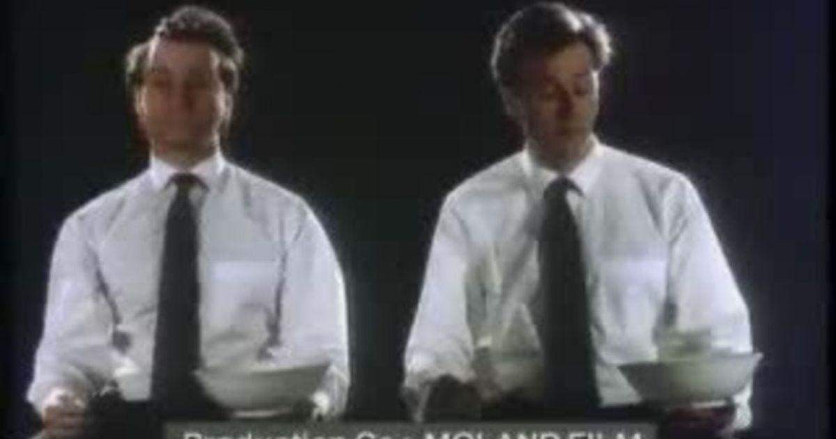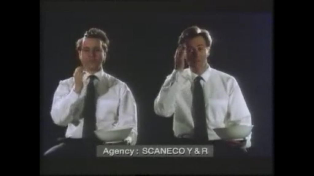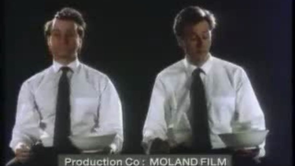 Two businessmen are sat in a black studio eating crisps, both wearing black ties and white shirts. Their eating is synchronised; they grab a crisp, put it in their mouth and run their fingers through their hair. The hair of the man on the left is stuck to his head due to his greasy crisps, the other man’s hair is fine. The man on the right is left with clean hands as he has been eating grease-free Polly crisps.