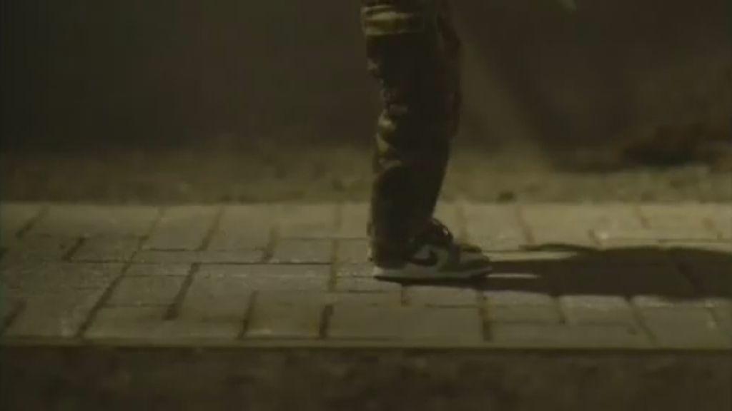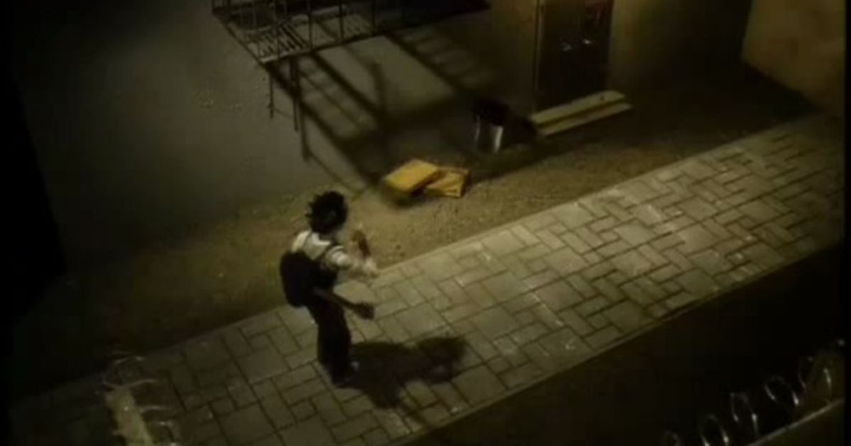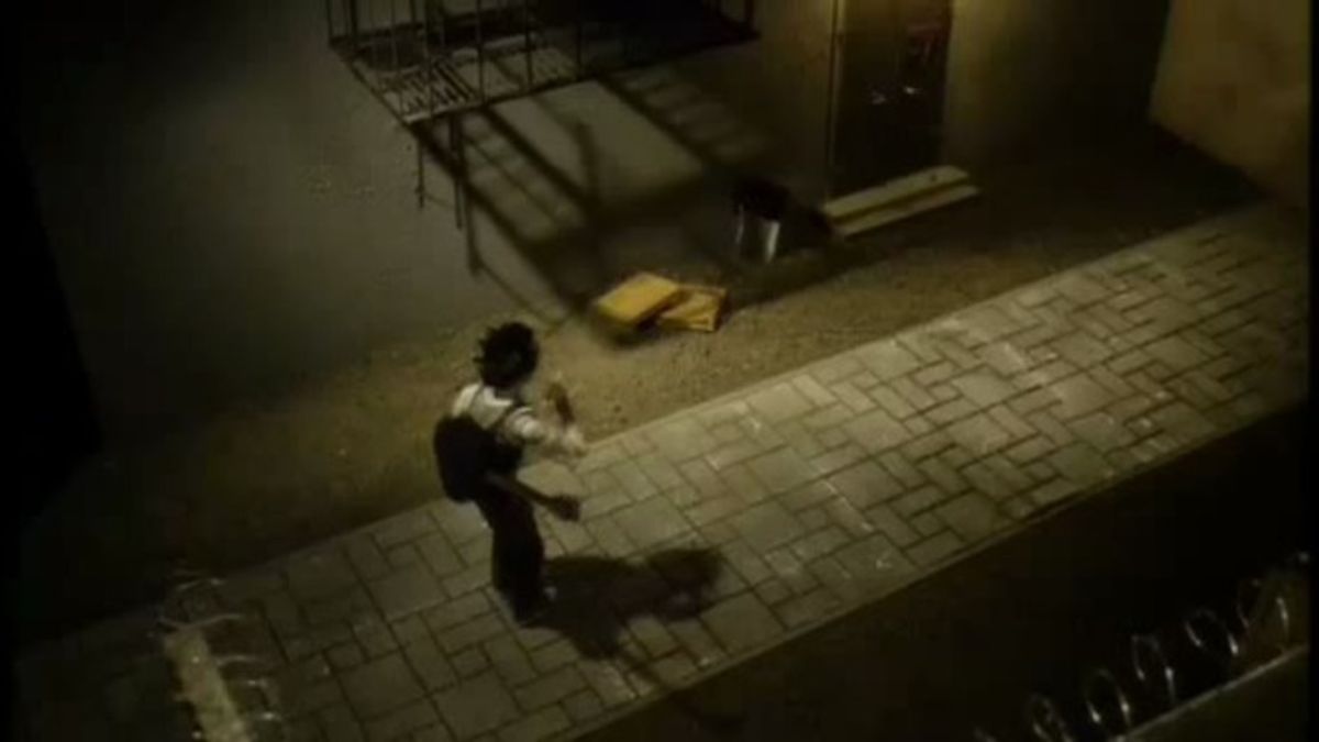 A lone figure, guitar slung over his back, enters a dark alley and is confronted