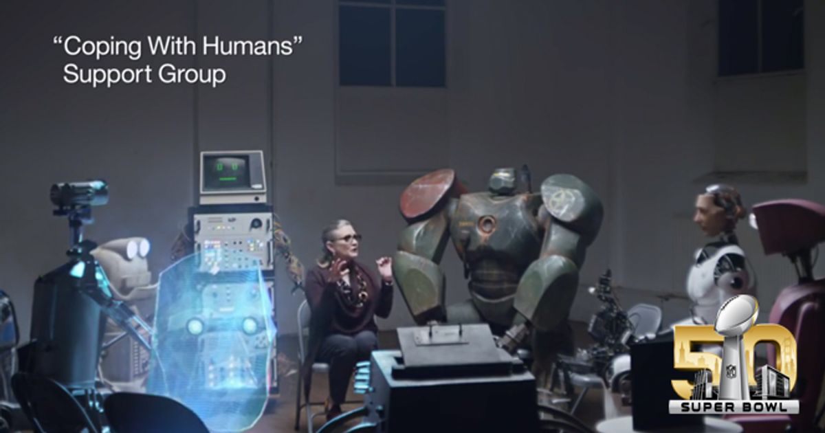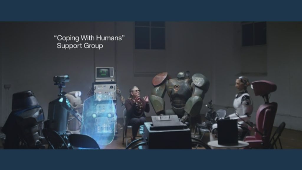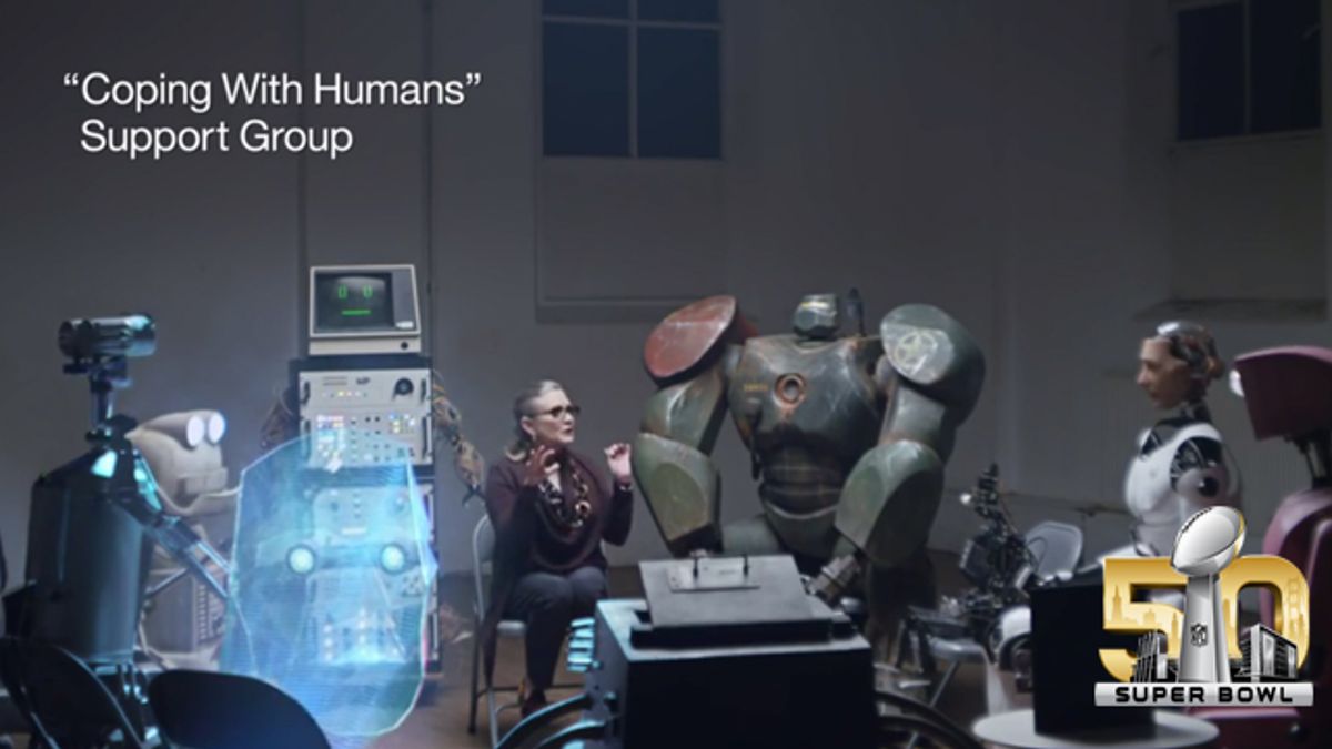Featuring a support group of maniacal machines, the spot sees Fisher try to guide the bots through their hatred of Watson, which works with humans to outthink competitors, challenges and limits.