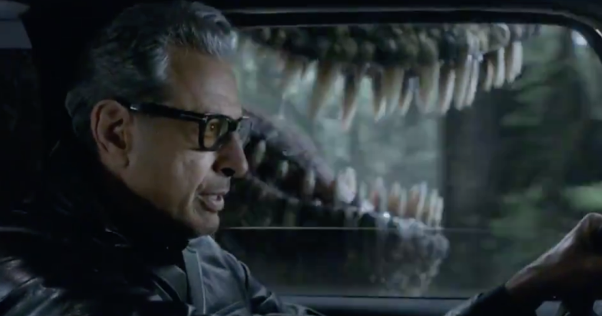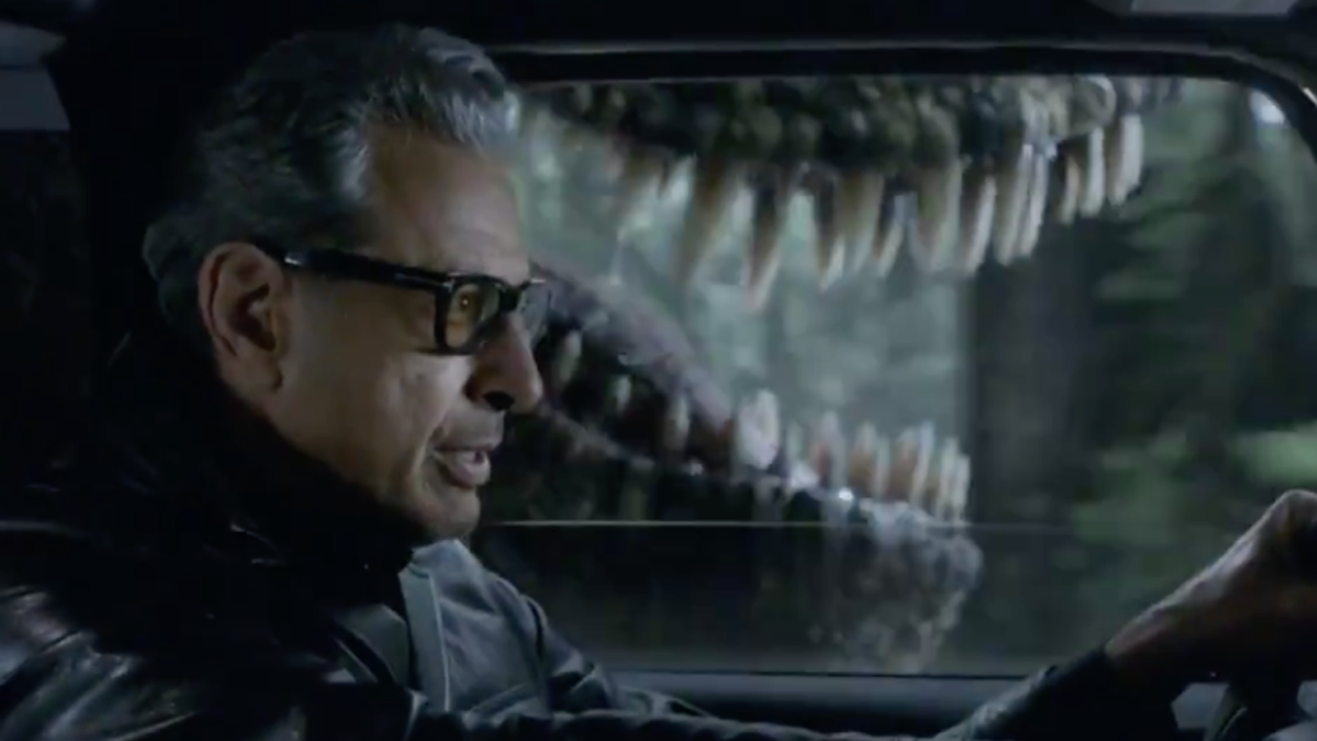 Ahead of the next movie instalment, Fallen Kingdom, Jeff Goldblum reprises his role as Dr Ian Malcolm and reimagines that famous T-Rex chase scene from the original Jurassic Park.