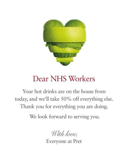 Pret a Manger this week announced that they would be providing free hot drinks and 50% off the price of food to all NHS staff. The company made a statement on social media that read; "Dear NHS workers, your hot drinks are on the house from today, and we’ll take 50% off everything else. Thank you for everything you are doing. We look forward to serving you. With love, everyone at Pret."