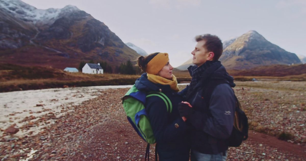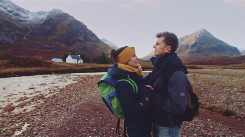 As a young man strums a melody on a guitar, a couple in hiking gear stop on their way along a river. As they dance, more strings are added in; a violin and a cello. The piece is muted and kind, but still full of bright moments. The setting is gorgeous, and the way that the colors pop on screen makes this movie seem expansive.