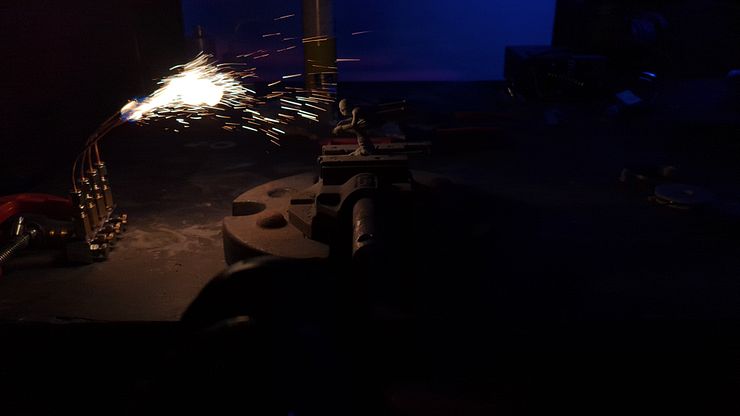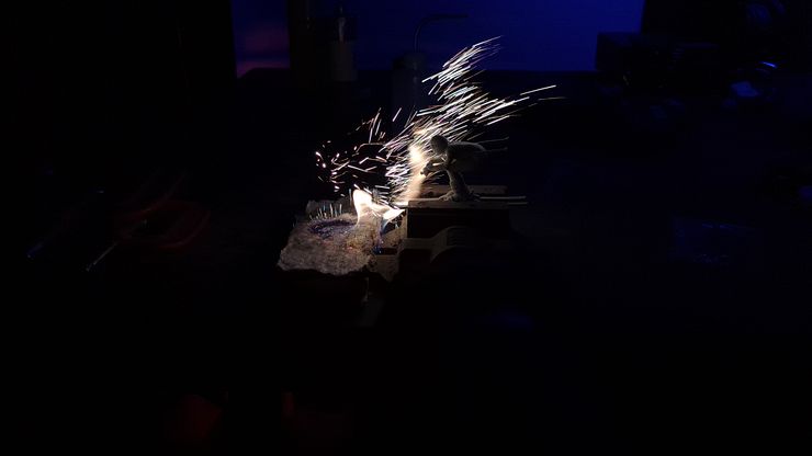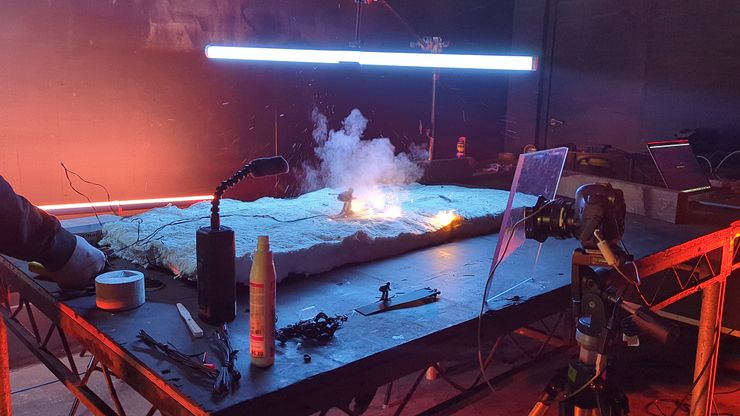 We dedicated just over a month purely to testing. We worked at Armory FX with specialist technicians who ensured safety and helped us explore different materials and techniques. We were literally playing with fire and observing how different materials behaved.