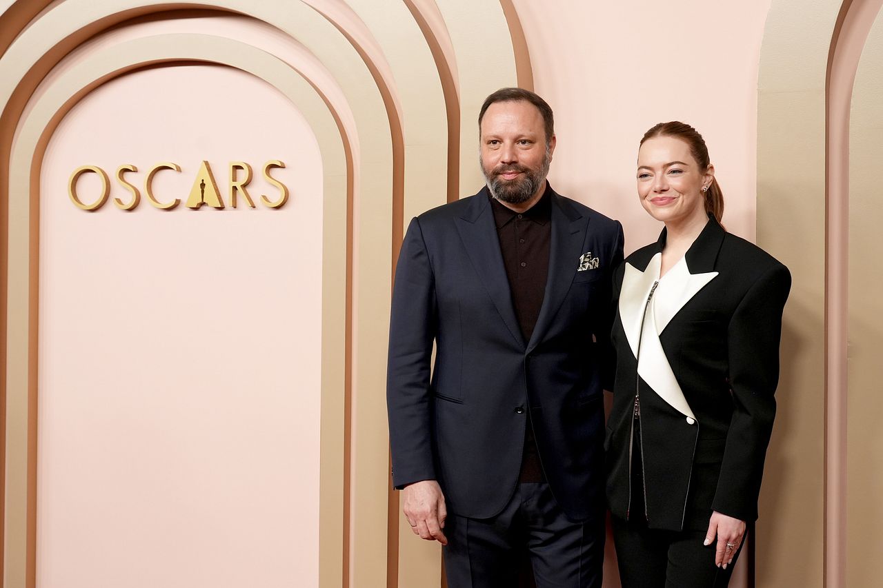 Above: Yorgos Lanthimos and Emma Stone, who picked up Best Actress for her role as Bella Baxter in Poor Things.