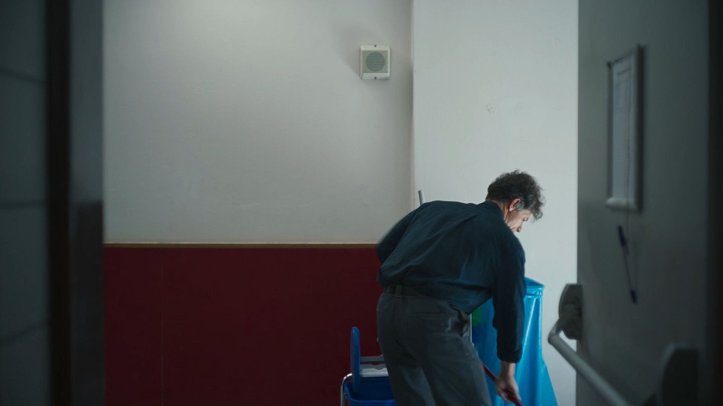 A janitor decides against mopping a bathroom stall.
