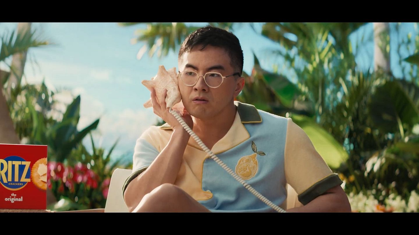 Bowen Yang takes a call on his shell phone in the big game teaser for Ritz crackers.